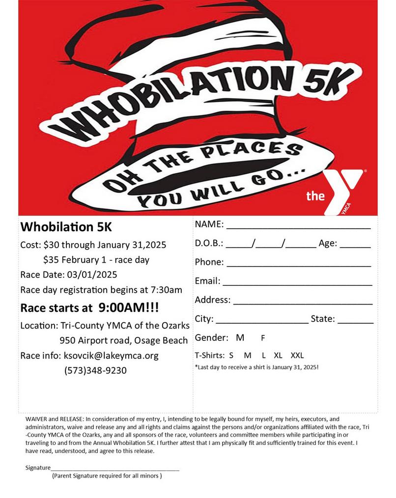 The Tri-County YMCA will hold its eighth annual Whobilation 5K Run/Walk on Saturday, March 7th, at the YMCA's facility on Airport Rd. in Osage Beach. The Dr. Suess-themed race will start at 9:00 a.m., with race-day registration opening at 7:30 a.m.