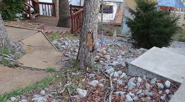 Note: The property line has been staked from the street to the seawall, and it appears to run right through the middle of the tree.