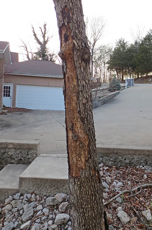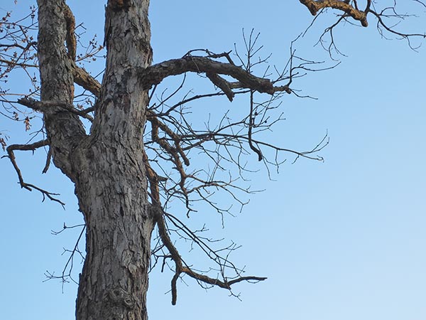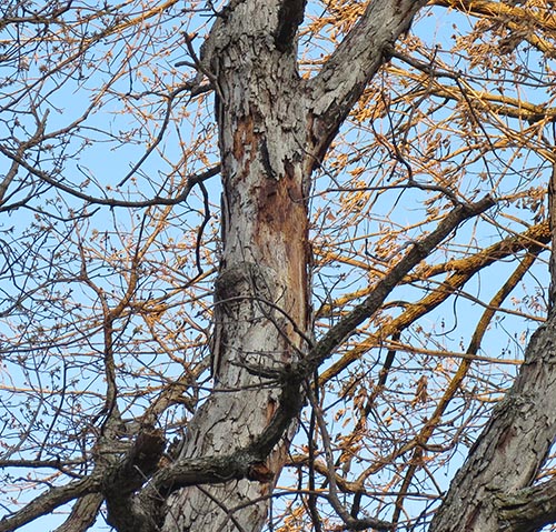 Not surprisingly, there are insect and woodpecker holes where the bark is missing.